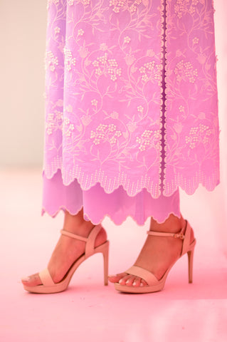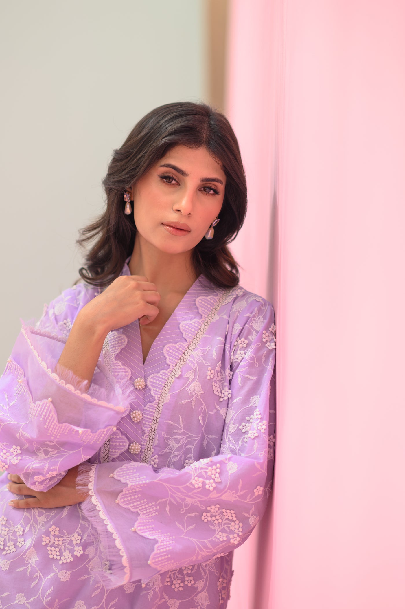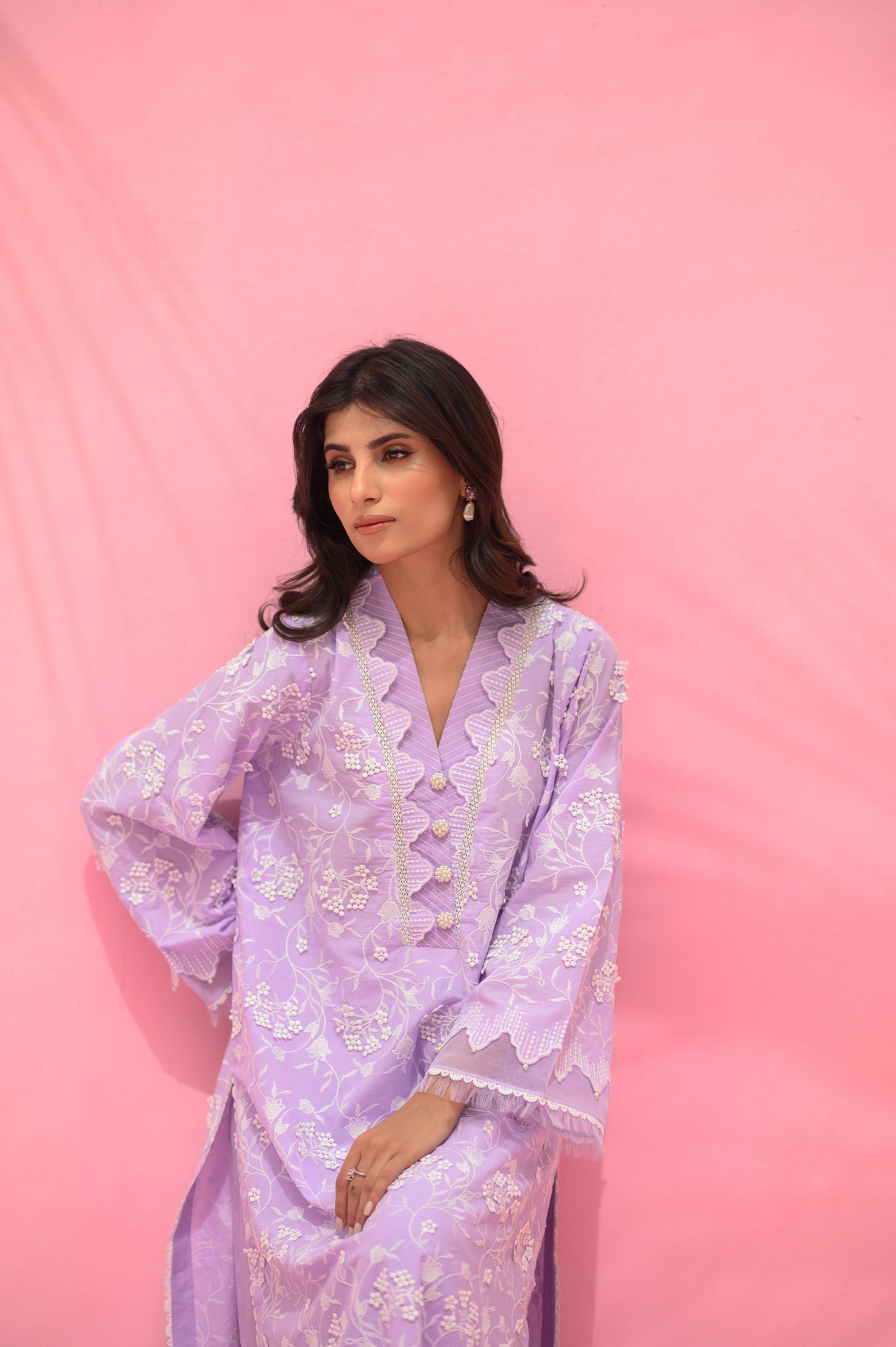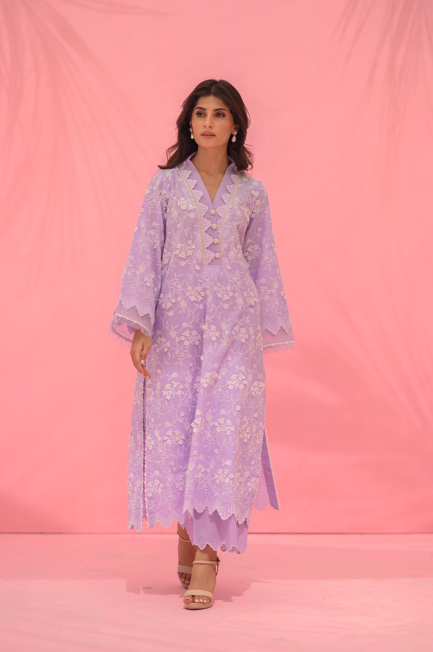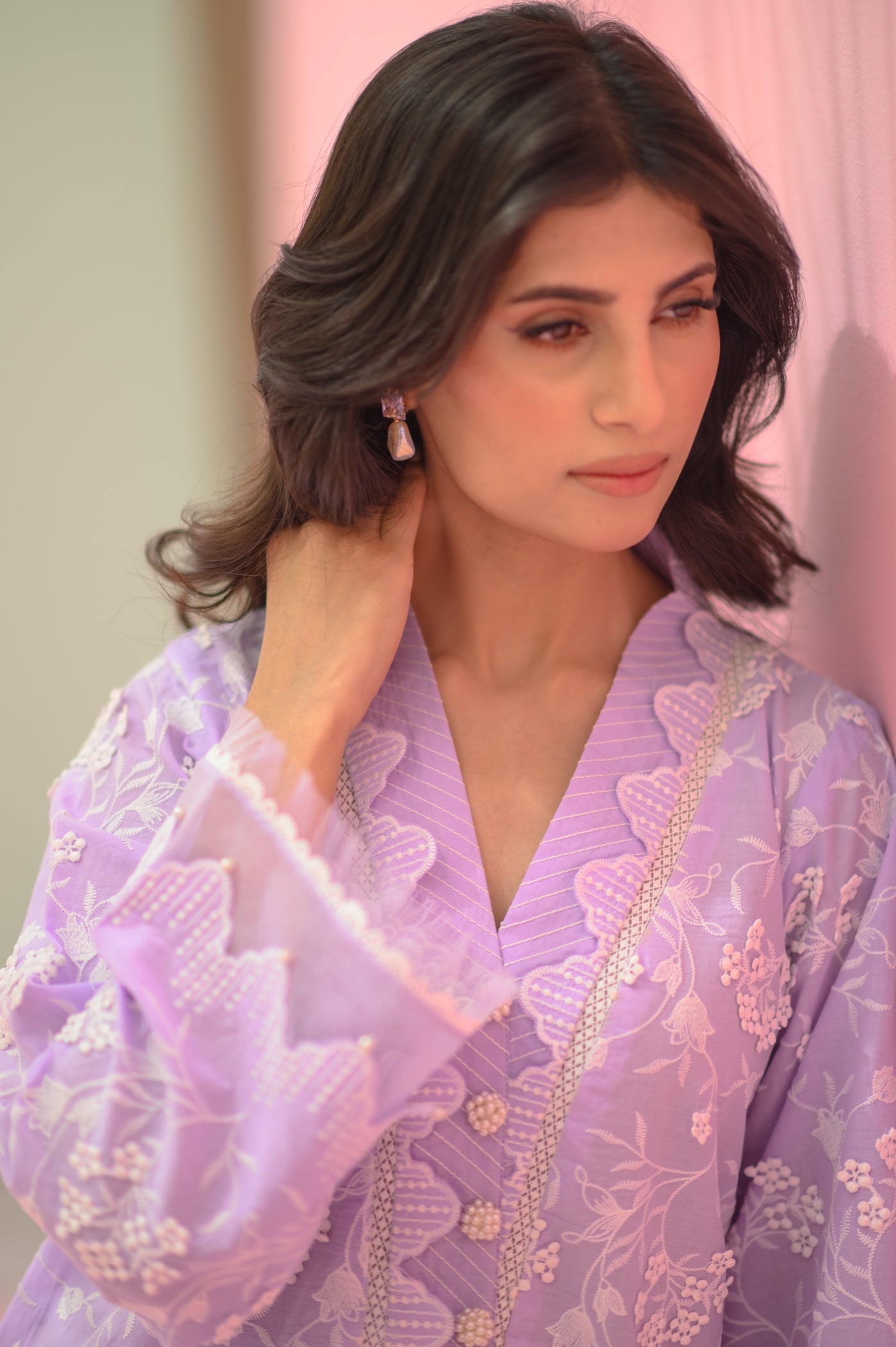 Designed in a graceful lavender cotton tone, this ensemble features delicate embroidery that enhances the soft romantic color palette. The relaxed silhouette offers effortless style and comfort.