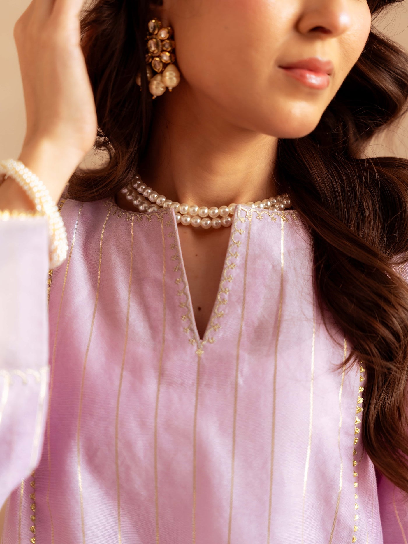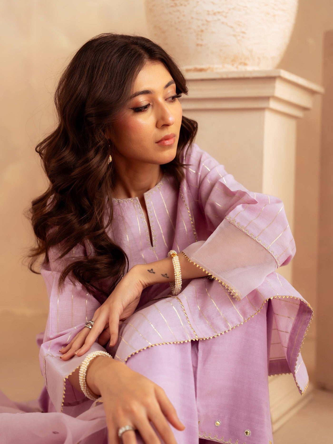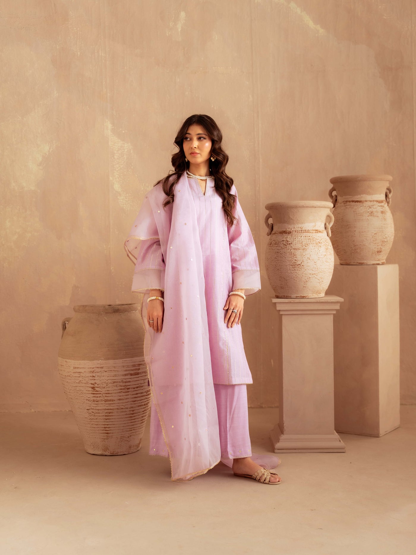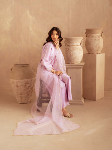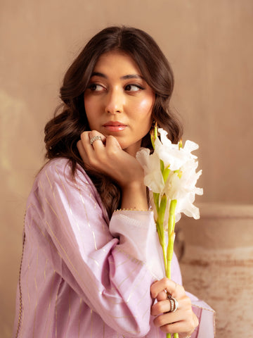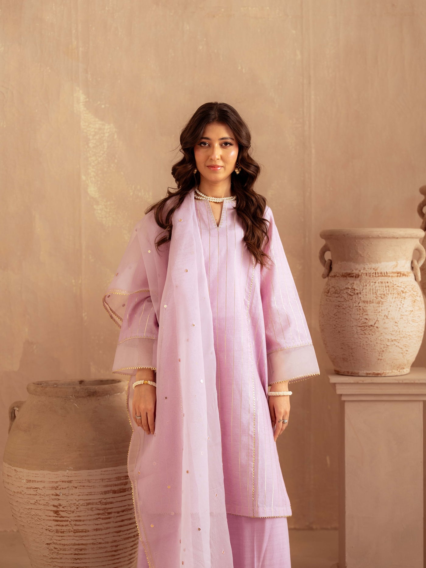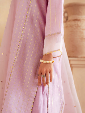Designed in premium yarn-dyed cotton silk, this ensemble offers a refined texture with a luxurious fall. The subtle golden vertical stripes create an elongated silhouette, while the delicately finished neckline and scalloped detailing add sophistication. The airy organza dupatta with scattered embellishments enhances elegance and movement, making it perfect for festive occasions and formal gatherings.