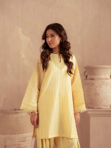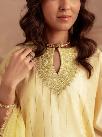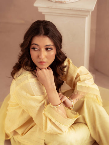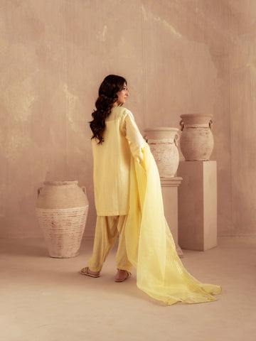 Crafted from premium yarn-dyed cotton silk, this outfit offers a soft, breathable texture with a luxurious fall. The intricately embroidered neckline paired with subtle golden stripe detailing adds a festive and refined touch. The lightweight organza dupatta enhances movement and elegance, while the cotton silk pants provide all-day comfort.