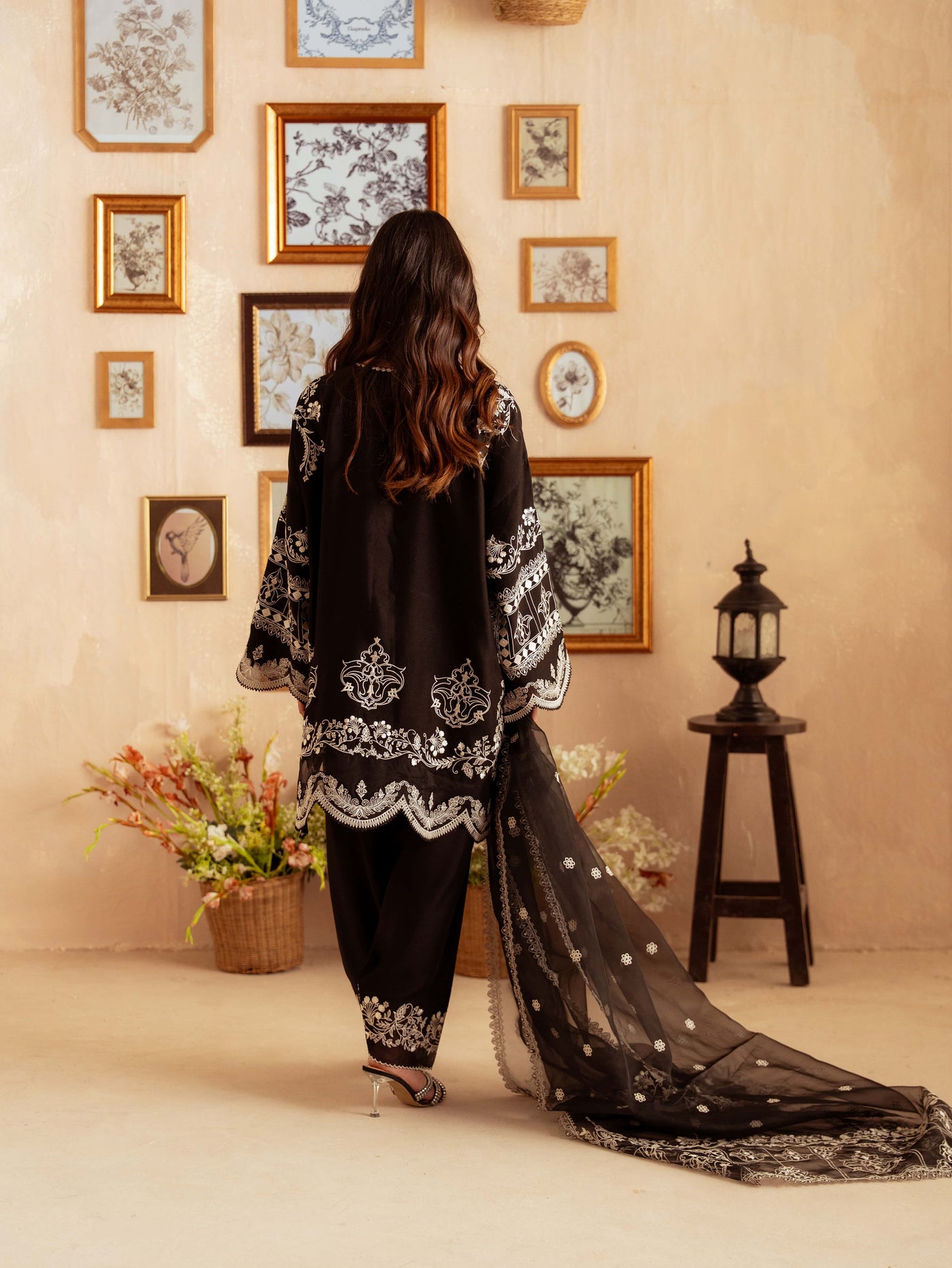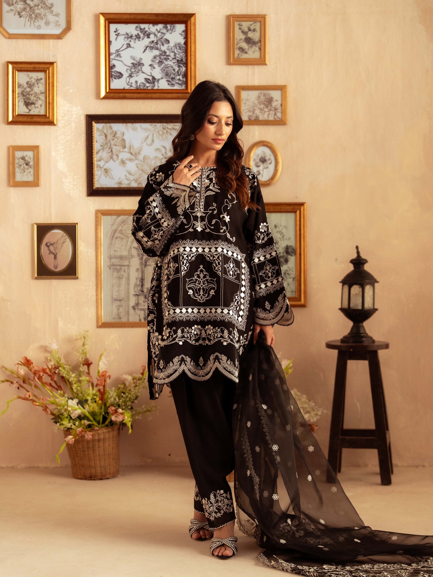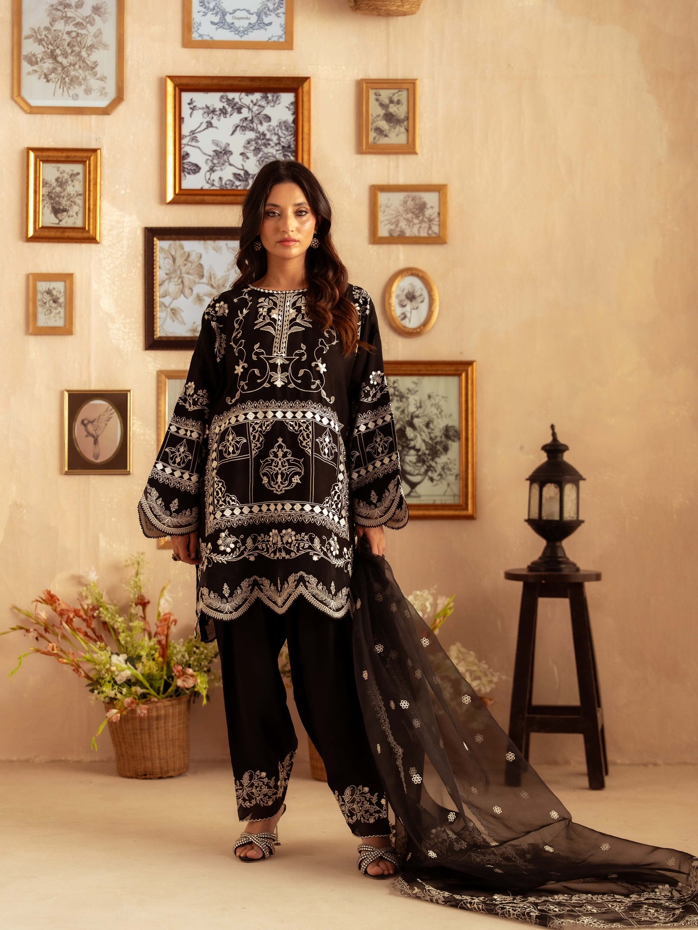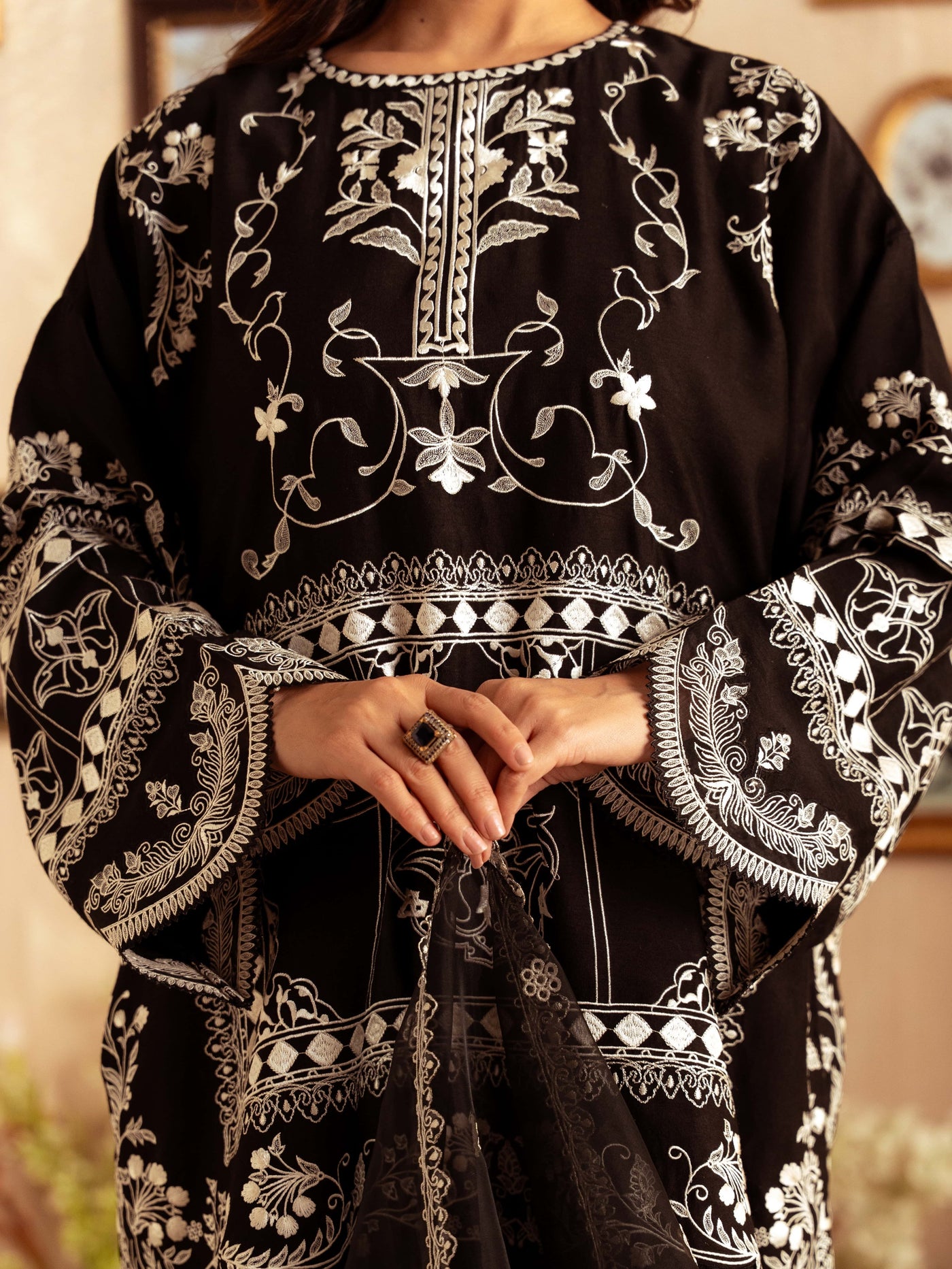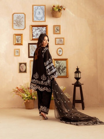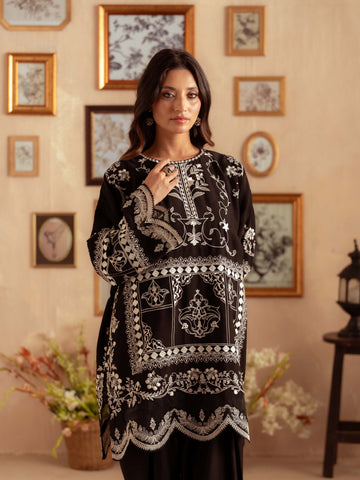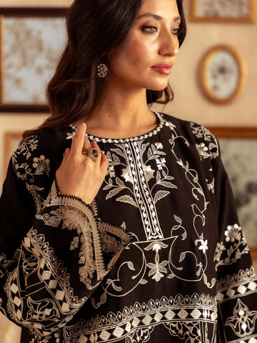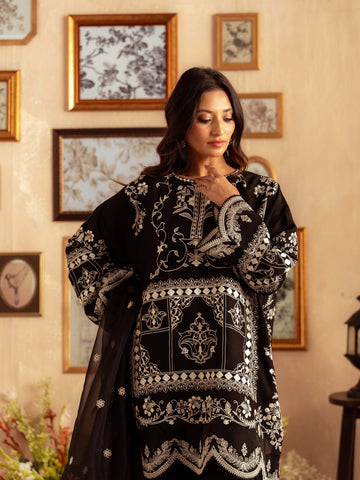 Crafted from premium yarn-dyed cotton silk, this striking black ensemble features intricate white embroidery that creates a stunning contrast. The heavily detailed front panel, ornate sleeves, and embroidered borders give this outfit a luxurious, statement look perfect for evening events, formal gatherings, and festive occasions.