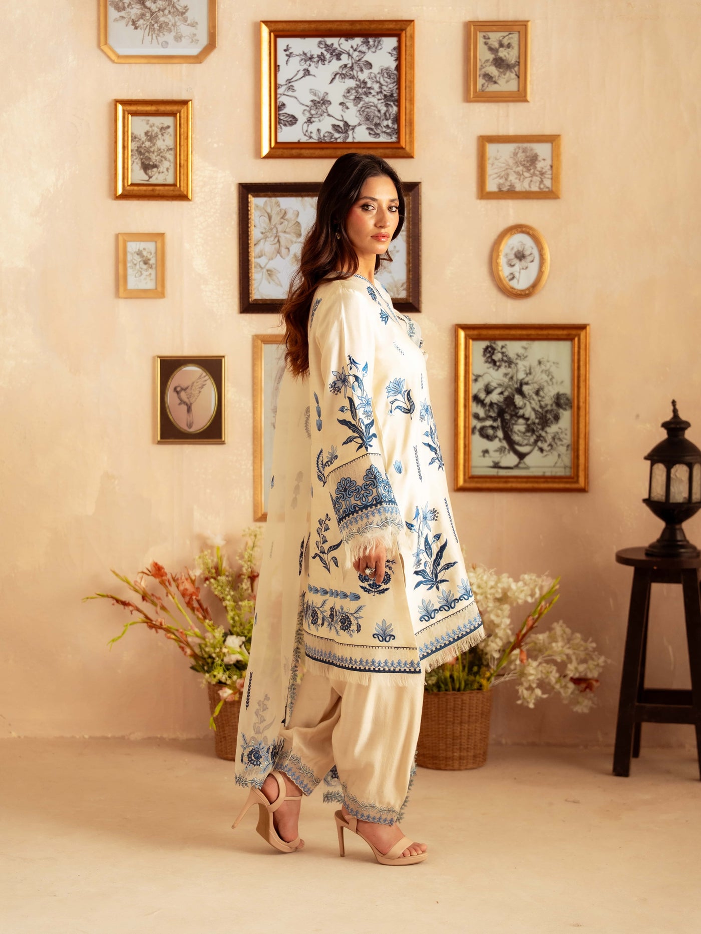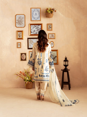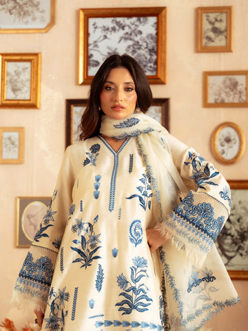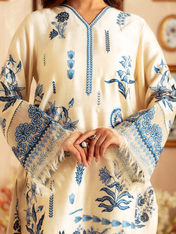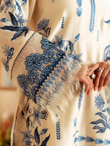 Crafted from premium yarn-dyed cotton silk, this ensemble offers a soft, breathable texture with a graceful fall. The subtle lilac-toned base is enhanced with intricate blue floral embroidery inspired by botanical patterns, giving it a timeless and sophisticated look.