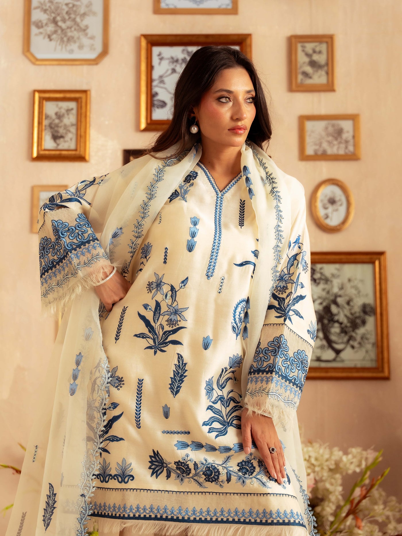 The statement sleeves feature detailed embroidery with delicate feather finishing, adding a touch of luxury and uniqueness. The lightweight organza dupatta flows effortlessly, completing the ensemble with elegance. Paired with matching cotton silk pants featuring embroidered borders, this outfit is ideal for festive gatherings, formal dinners, and special occasions.